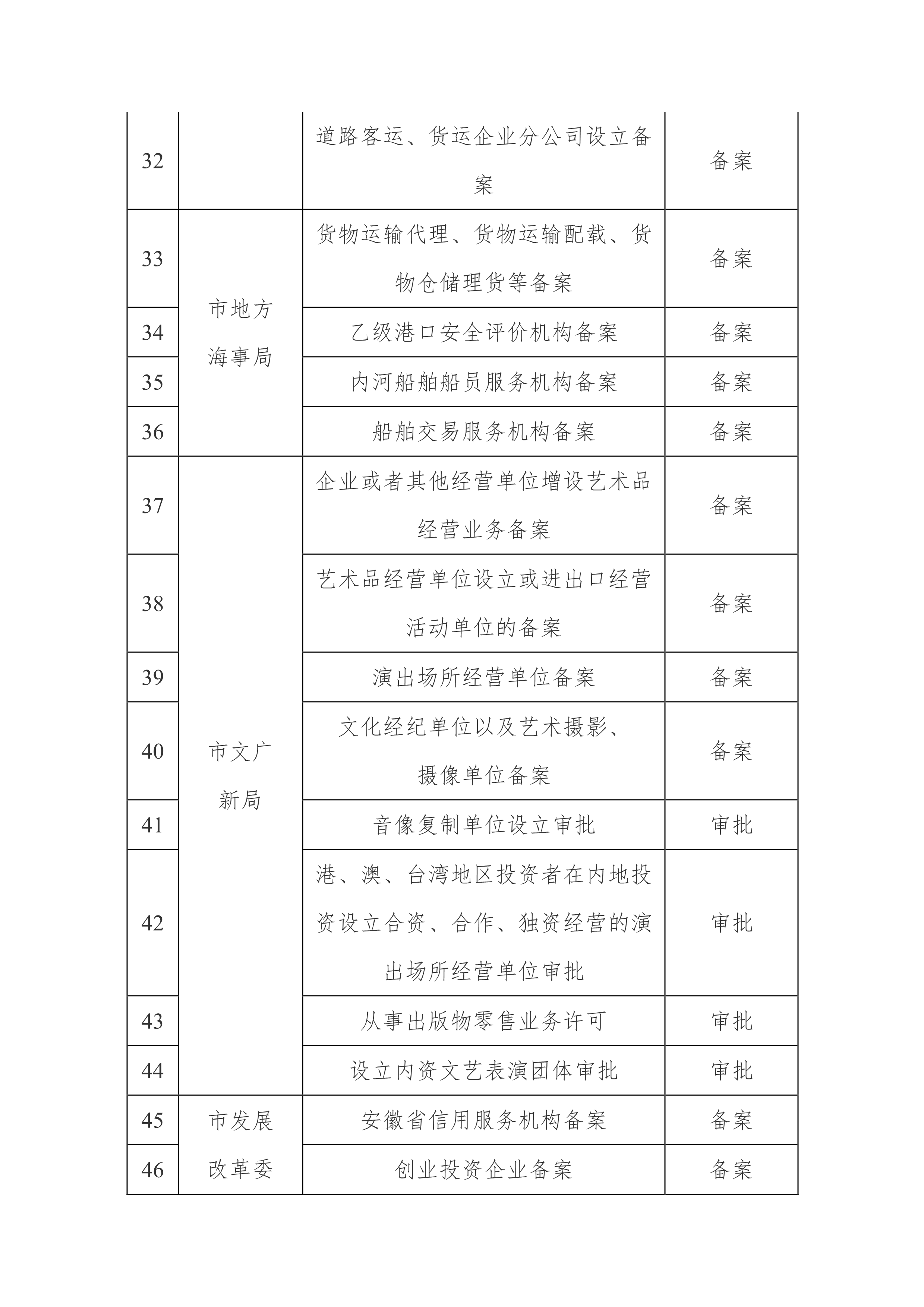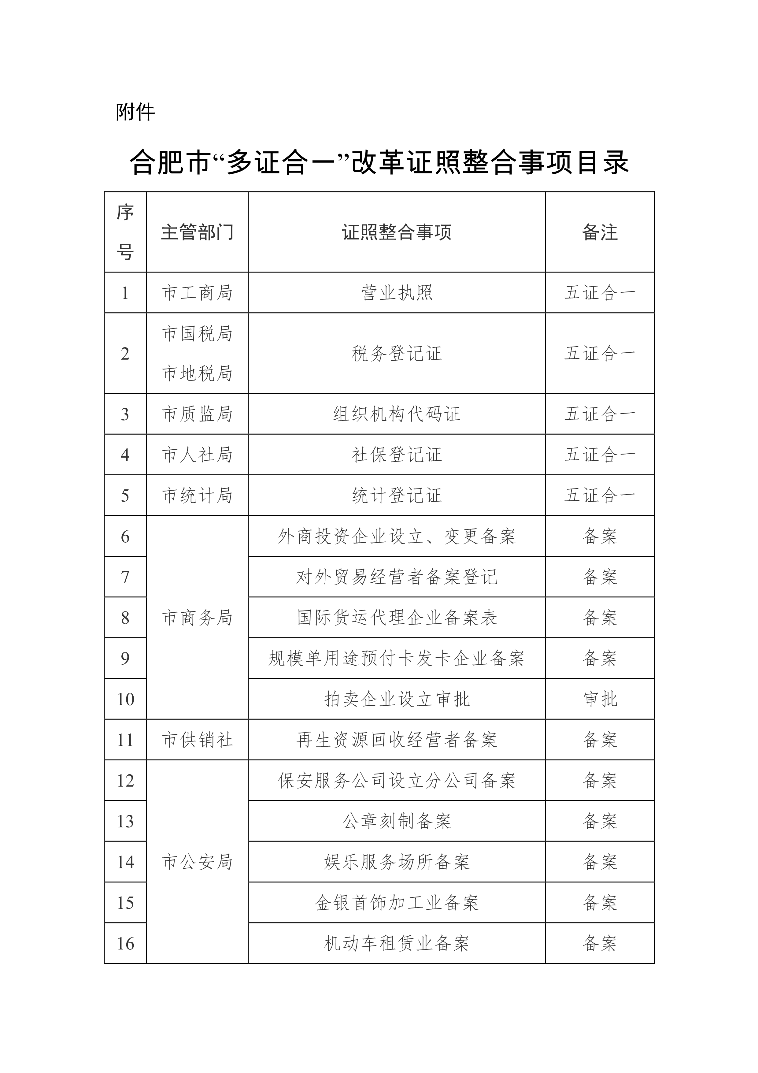 (一)梳理证照事项,确定整合范围。按照能整合的尽量整合、能简化的尽量简化、该减掉的坚决减掉的原则,全面梳理、分类处理涉企证照事项,将信息采集、记载公示、管理备查类的一般经营项目涉企证照事项,以及企业登记信息能够满足政府部门管理需要的涉企证照事项,整合到营业执照上,被整合证照不再发放,实行“多证合一、一照一码”。确定公布《合肥市“多证合一”改革证照整合事项目录》(以下简称《目录》),并实行动态管理。今后因法律、法规、国务院决定新设或调整为信息采集、记载公示、管理备查类的涉企证照事项,一律实行“多证合一、一照一码”登记,不再另行发文规定,由相关部门告知市级工商行政管理部门载入《目录》并及时向社会公布。已经纳入“多证合一”改革的事项,因设定依据取消或确因管理需要进行调整的,由相关部门告知市级工商行政管理部门对《目录》实行动态调整并及时向社会公布。对于关系公共安全、经济安全、生态安全、生产安全、意识形态安全的涉企证照事项继续予以保留,实行准入清单管理。(市工商局、市编办、市政府法制办、市政务服务中心负责,列在首位的为牵头单位,下同。)