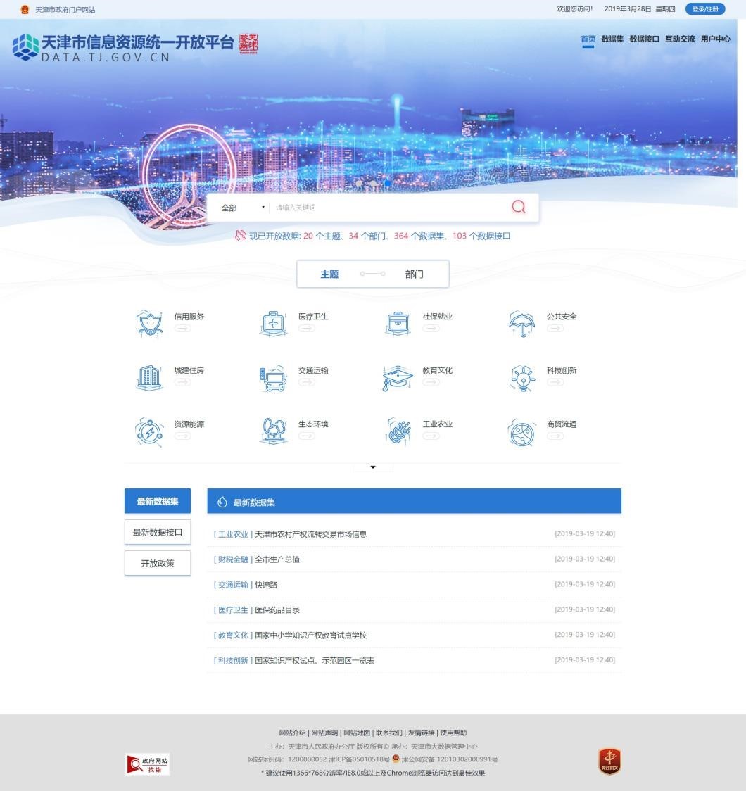 据悉,天津市信息资源统一开放平台已接入34个市级部门的开放数据,包含364个数据集、 103个数据接口,涵盖信用服务、医疗卫生、社保就业、公共安全、城建住房、交通运输、教育文化、科技创新、资源能源、生态环境等20个主题。该平台下设“数据集、数据接口、互动交流、用户中心”等栏目,用户可以在首页按主题分类或部门分类查看相关数据,也可直接检索需要的数据。平台提供数据集下载、API接口服务,用户可自行选择获取数据资源的方式;对开放数据的需求以及其他建议,用户可以在“互动交流”栏目下提交反馈。