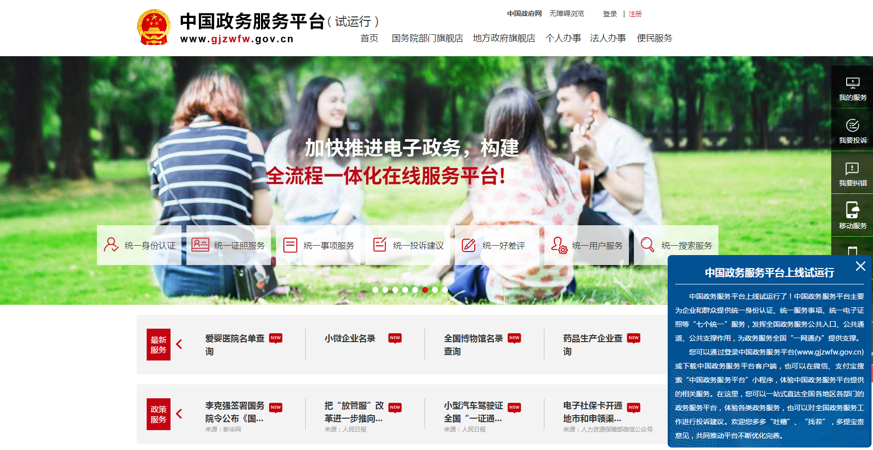 中国政务服务平台上线试运行了!中国政务服务平台主要为企业和群众提供统一身份认证、统一服务事项、统一电子证照等“七个统一”服务,发挥全国政务服务公共入口、公共通道、公共支撑作用,为政务服务全国“一网通办”提供支撑。