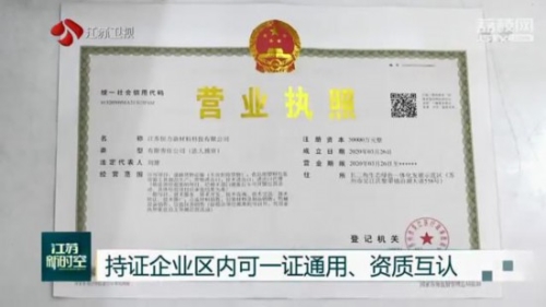 领取这张执照的是江苏恒力新材料科技有限公司,企业将来在苏州吴江、上海青浦和浙江嘉善这示范区三地拓展业务、开设分支机构等,无须像原来一样再办理当地营业执照,可以一证通用、资质互认,为企业在示范区内自由流动和迁徙打下基础。