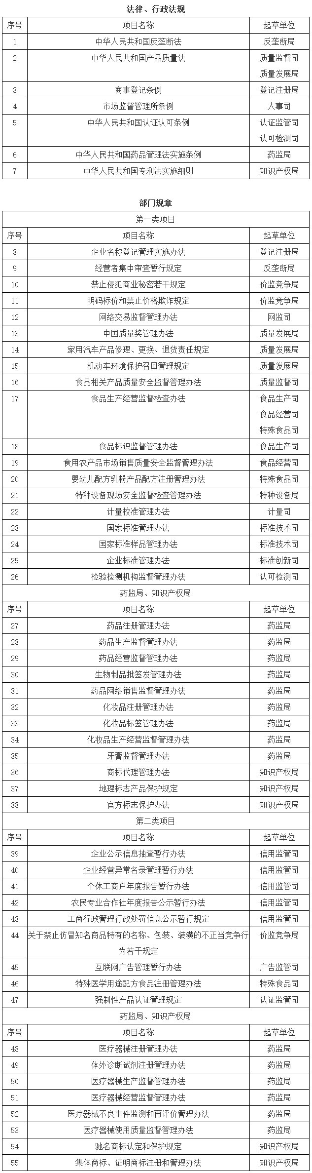 (一)拟起草法律、行政法规送审稿7部:中华人民共和国反垄断法、中华人民共和国产品质量法、商事登记条例、市场监督管理所条例、中华人民共和国认证认可条例、中华人民共和国药品管理法实施条例、中华人民共和国专利法实施细则。
