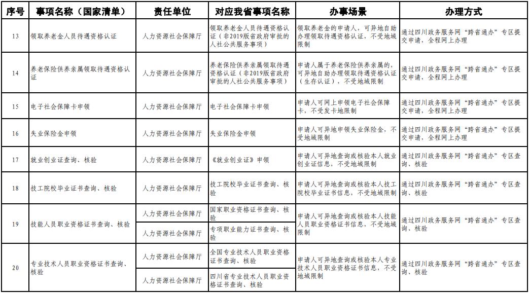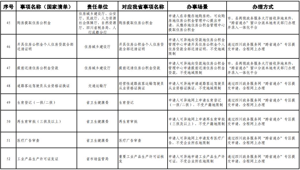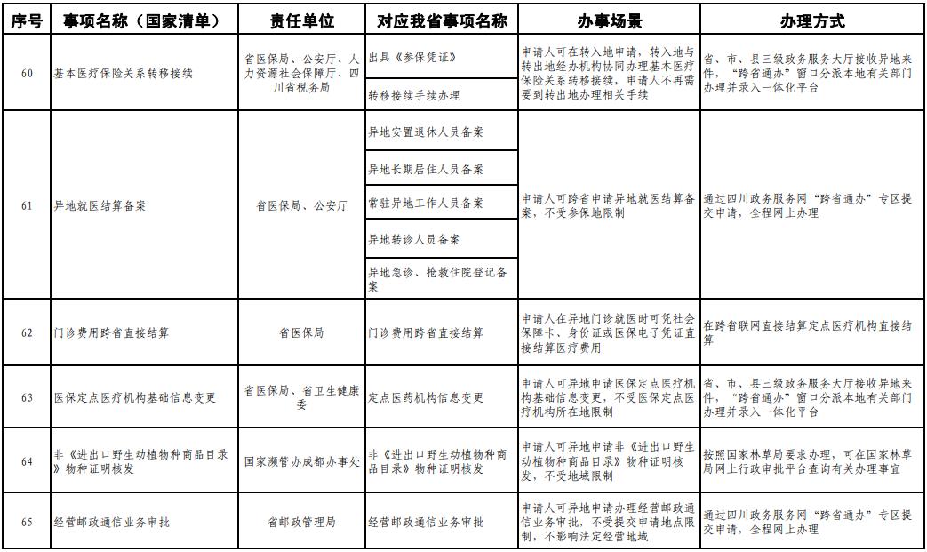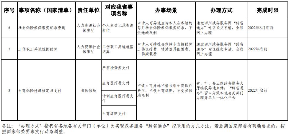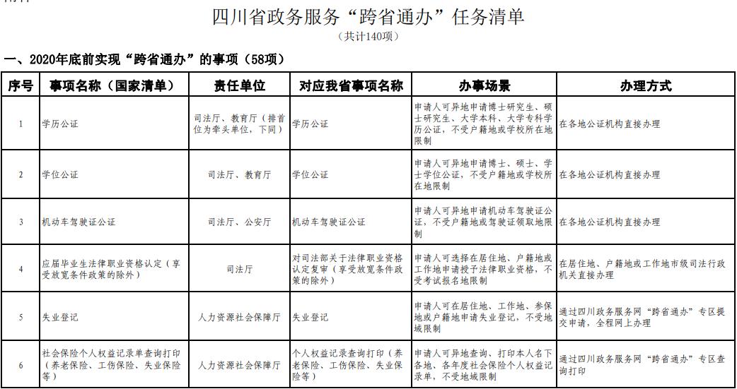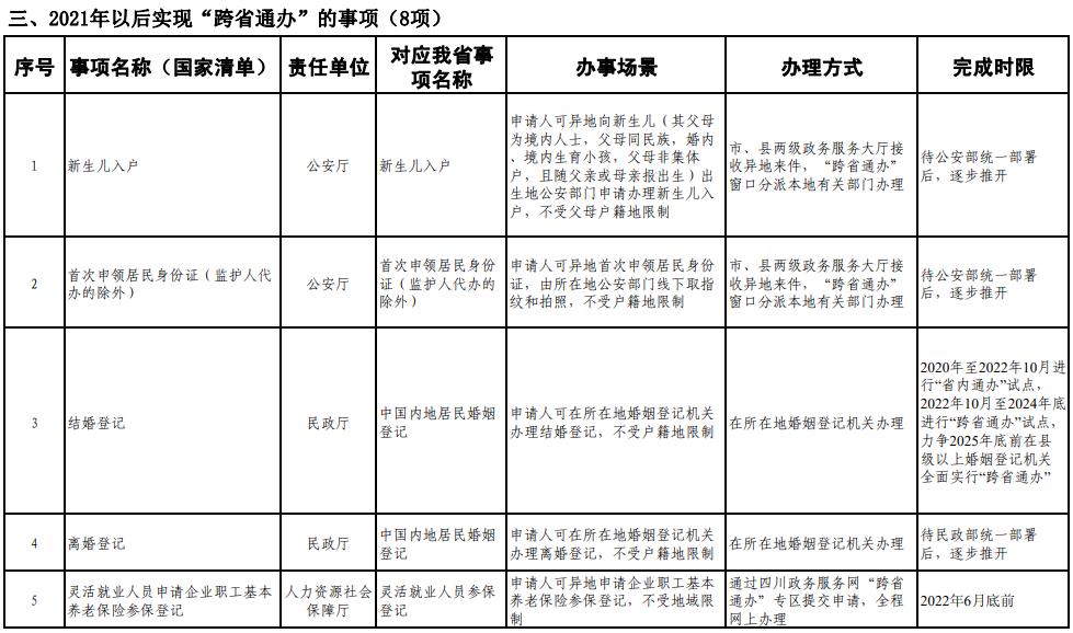 《工作方案》明确,按照《四川省政务服务“跨省通办”任务清单》,2020年底前实现第一批事项“跨省通办”,2021年底前基本实现高频政务服务事项“跨省通办”,并逐步纳入其他办事事项,有效满足各类市场主体和广大人民群众异地办事需求,为建设人民满意的服务型政府提供有力保障。