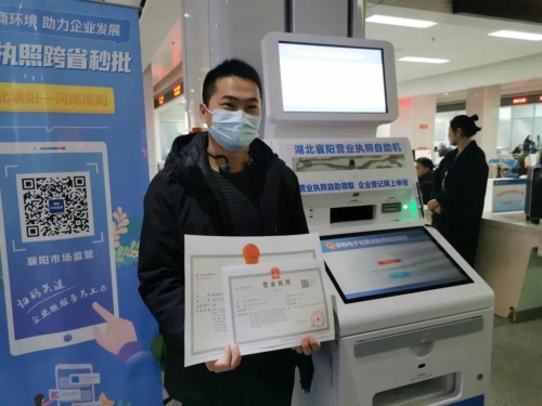 因经营需要,申请人张立锦拟在襄阳注册成立襄南商贸有限公司,需新办营业执照,但张立锦身处南阳且无法到襄阳进行现场办理。襄阳市市场监管局窗口工作人员了解到这一情况后,积极与该公司申请人介绍企业开办“跨省通办”这一利好政策,告知申请人只需登录“湖北市场监管智慧办平台(襄阳)”填报企业开办所需信息,异地实名认证完成后,在襄阳市市场监管局投放至南阳的“营业执照自助办理机”上插入身份证即可轻松领取营业执照。
