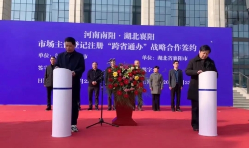 12月22日,河南南阳-湖北襄阳市场主体登记注册“跨省通办”启动仪式在河南省南阳市行政审批服务中心举行。湖北省襄阳市市场监督管理局与河南省南阳市市场监督管理局正式签订《市场主体登记注册“跨省通办”战略合作协议》,依托“互联网+政务服务”开启市场主体“跨省通办”新模式,为企业和办事群众提供更加优质、高效、便捷的政务服务。