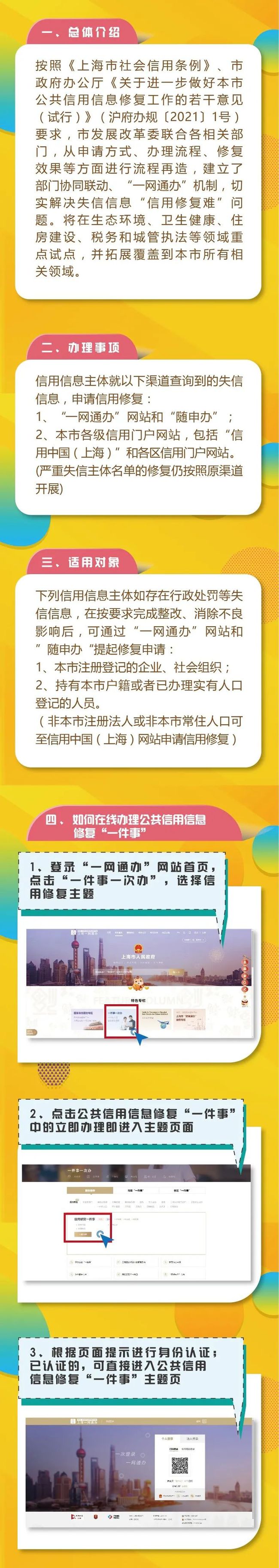 上海市发展改革委说,3月1日,公共信用信息修复“一件事”在“一网通办”总门户“一件事一次办”和“随申办”正式上线,本市自然人和企业法人等主体可登录“一网通办”“随申办”,就税务、卫健、生态环境、住建、城管领域的行政处罚等失信信息,在线提交修复申请。详见↓
