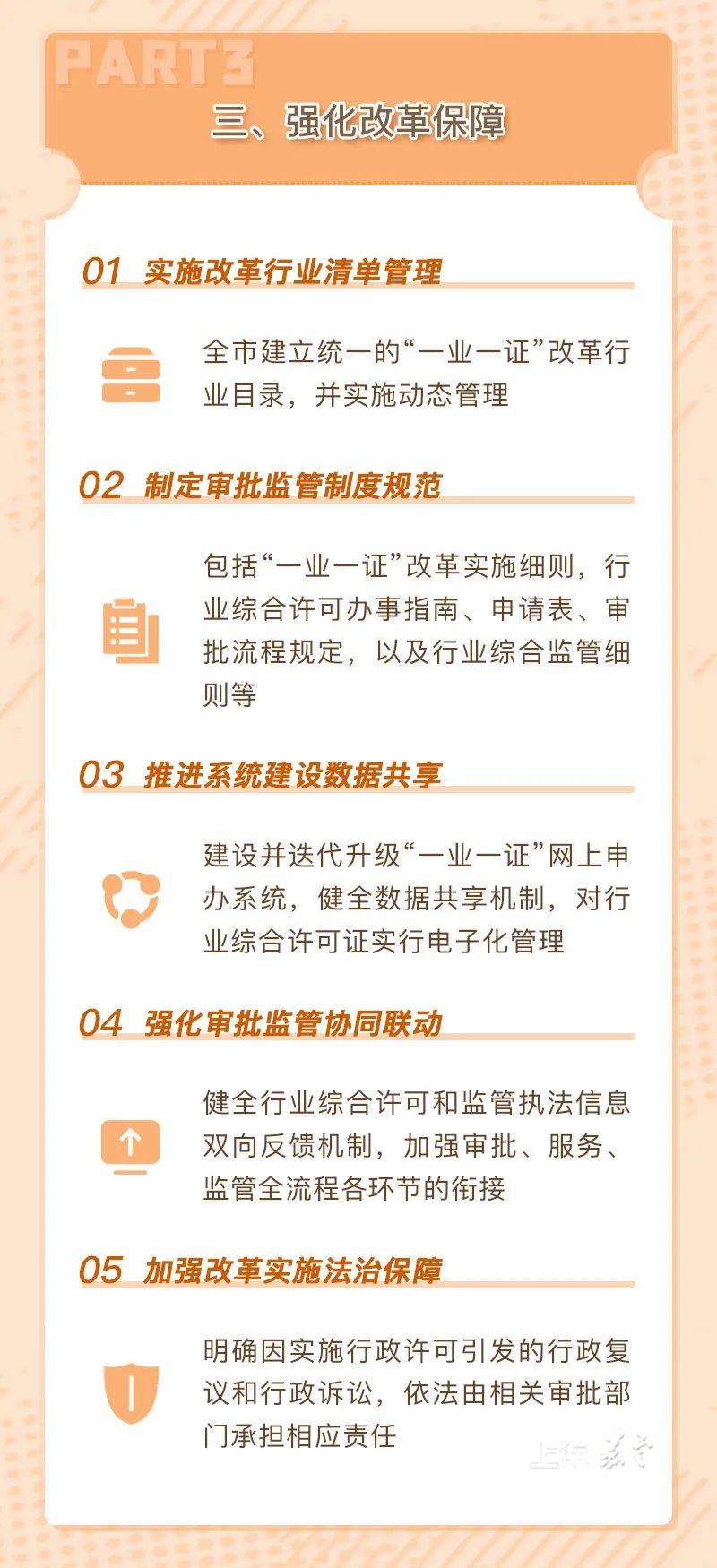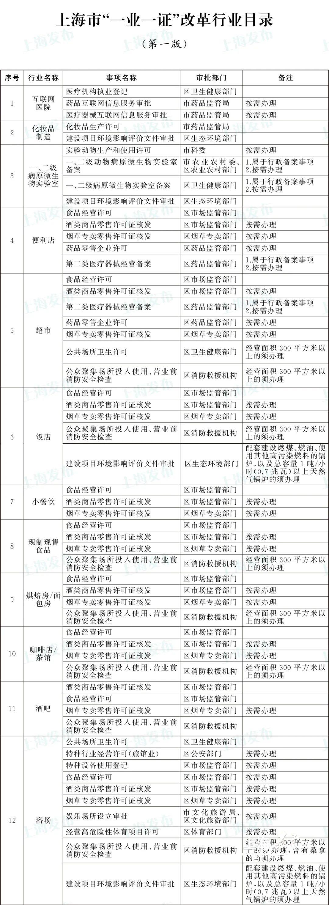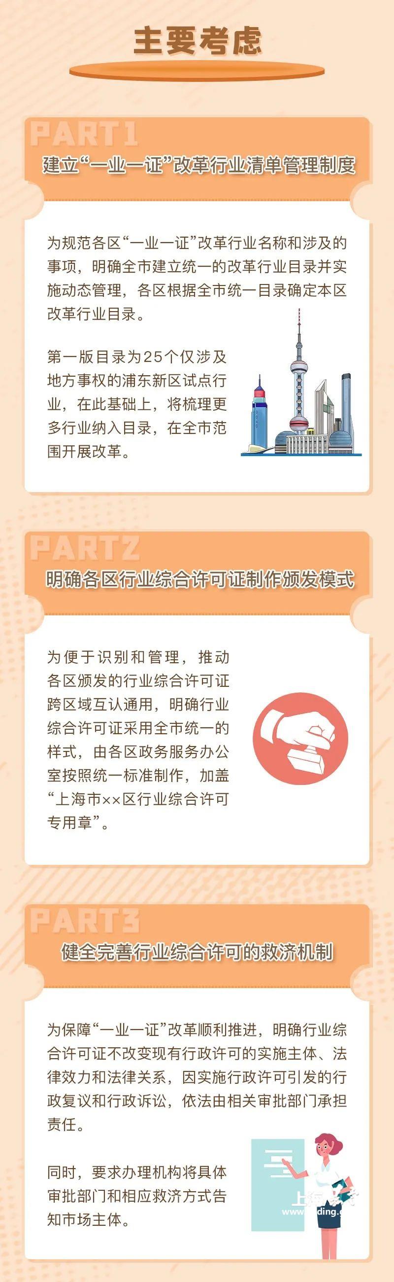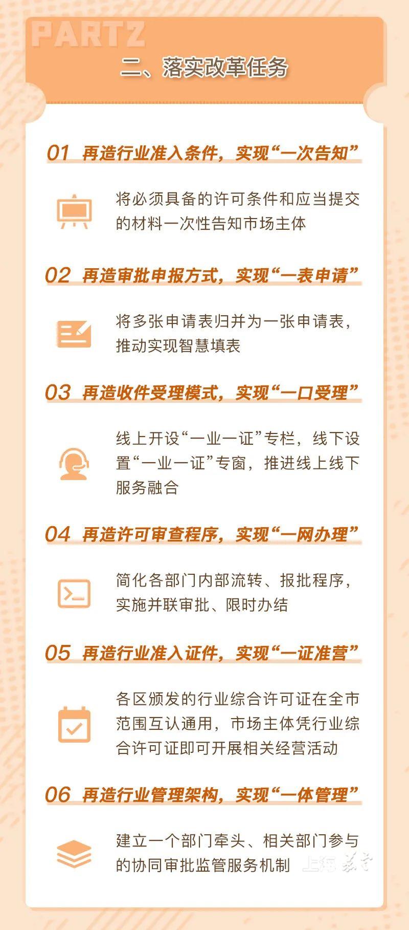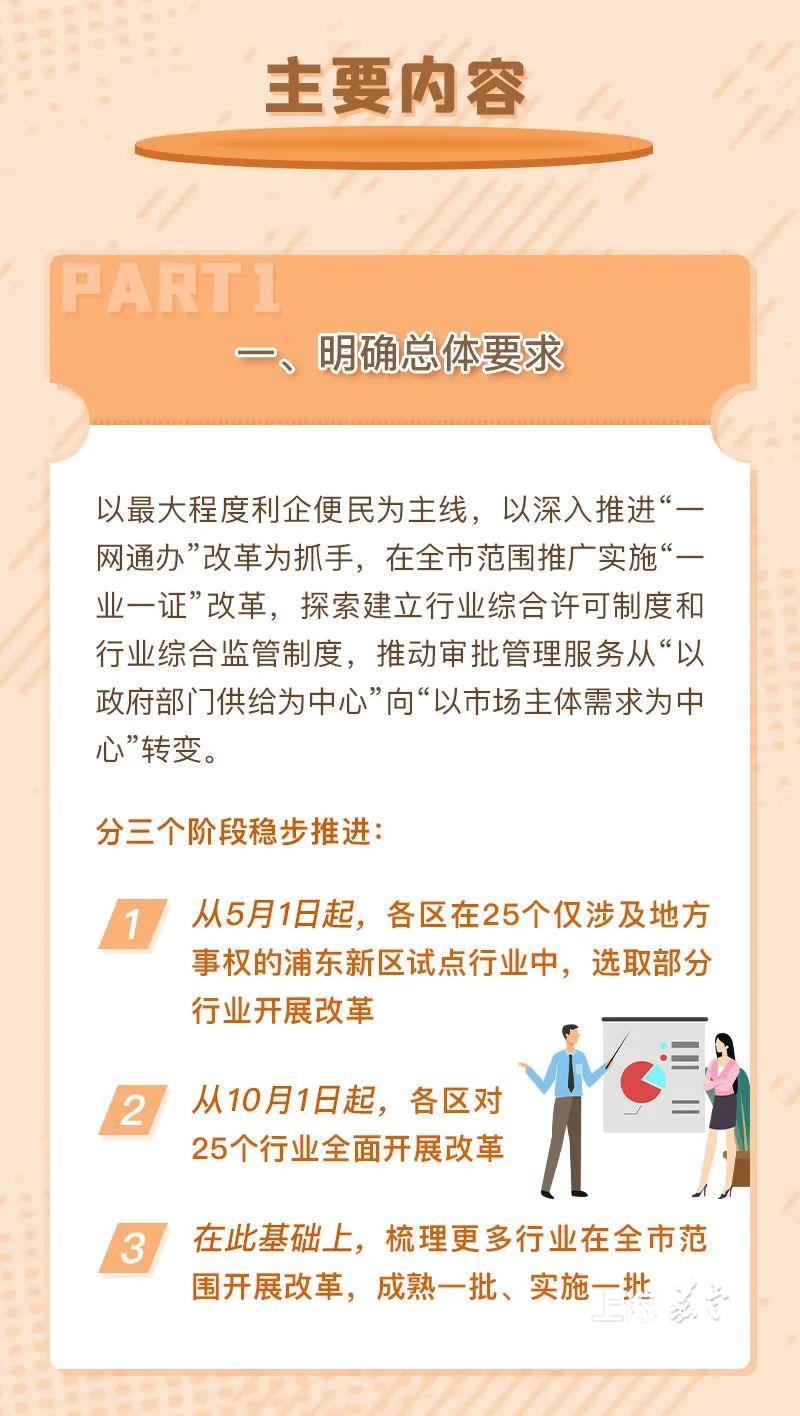 中国上海门户网站发布《关于在全市范围推广实施“一业一证”改革的指导意见》,主要目标是:对国务院批复同意浦东新区首批试点的25个仅涉及地方事权行业,各区从2021年5月1日起,选取部分行业实施“一业一证”改革;从2021年10月1日起,全面实施“一业一证”改革。在此基础上,推动更多市场主体关注度高、办理频次高的行业在全市范围实施“一业一证”改革,成熟一批、实施一批。