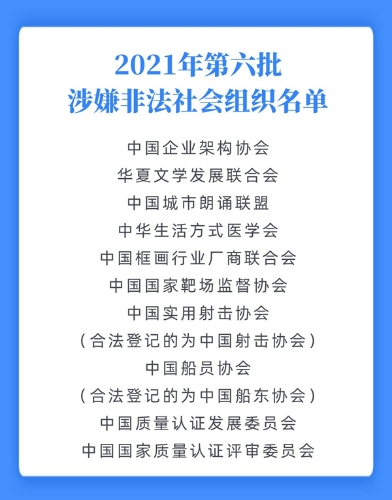 人民网北京11月10日电 (王仁宏)为进一步加大对非法社会组织的打击整治力度,充分发挥社会监督作用,民政部今日公布2021年第六批涉嫌非法社会组织名单,中国质量认证发展委员会、中国实用射击协会(合法登记的为中国射击协会)、中国船员协会(合法登记的为中国船东协会)等10家涉嫌非法社会组织在列。