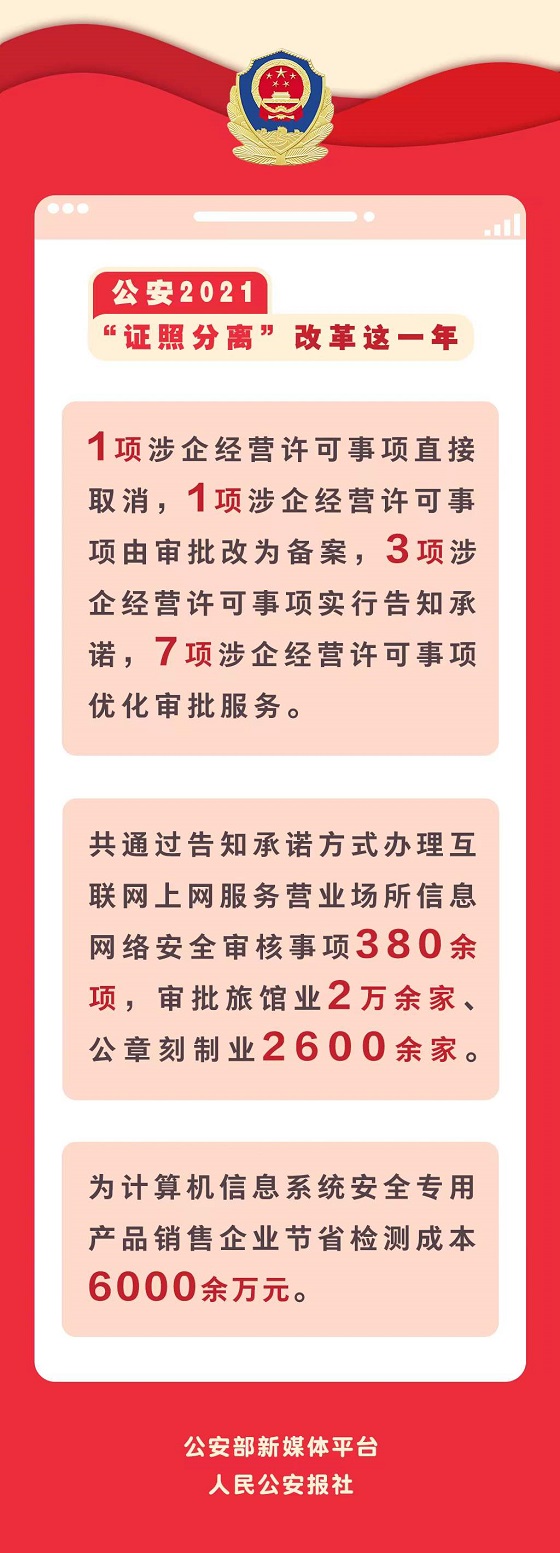2021年,全国公安机关大力推进审批制度改革,将12项涉企经营许可事项纳入“证照分离”改革工作方案,不断推动各项措施落地见效,有效压缩了审批时效、优化了审批流程,进一步优化营商环境,激发市场主体发展活力。