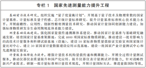 构建现代先进测量体系。加强以量子计量为核心的先进测量体系建设,加快建立新一代国家计量基准,推进社会公用计量标准升级换代,制定一批关系国计民生的重要计量技术规范。改革完善计量器具型式批准、检定、法制监督等管理制度,对强制管理的计量器具目录实施动态调整,完善商品量、计量数据等量值监管制度。深入推进计量技术机构改革创新发展,探索计量校准市场和校准机构建设的有效途径,规范计量校准市场,满足市场对量值溯源和测试服务的需求。建立国家计量数据建设应用示范基地,提升国家产业计量测试和能源计量能力。积极参与国际计量比对,提升国际承认的校准与测量能力。