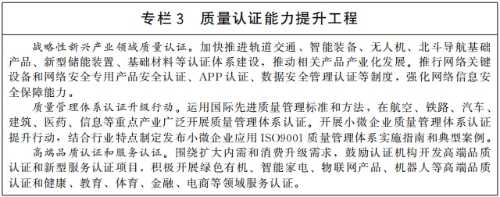 提高质量认证服务能力。加快构建统一管理、共同实施、权威公信、通用互认的质量认证体系,全面提升质量认证服务能力,打造一批具有国际竞争力的认证品牌。推动完善重点产业质量认证制度体系,加大网络安全认证制度推行力度,加快战略性新兴产业领域质量认证制度建设,大力推行高端品质认证和新型服务认证,加快研究和完善国家数据安全标准与认证认可体系。广泛开展质量管理体系认证升级行动。健全政府、行业、社会等多层面的认证采信机制,推动在市场采购、行业管理、行政监管、社会治理等领域广泛采信认证结果。提升认证行业专业化集约化水平,优化行业布局结构,推动认证行业数字化发展。