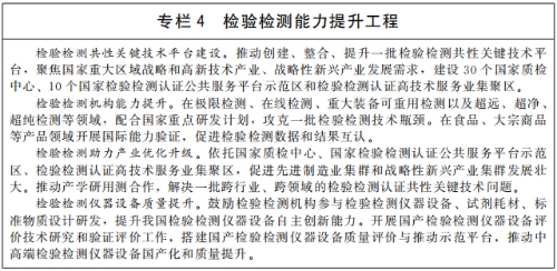 加大认可和检验检测改革创新力度。建立适应高质量发展需要的认可和检验检测体系,实现检测能力显著增强、行业规范运行水平和社会公信力明显提升。稳定事关人民群众身体健康和生命财产安全、公共安全、生态环境安全等方面的检验检测队伍,建设强有力的权威实验室。坚持市场化改革方向,积极推进事业单位性质的检验检测认证机构改革,促进第三方检验检测认证机构发展。建立健全检验检测认证行业品牌培育、发展、激励、保护政策和机制,推动检验检测认证服务业做优做强。推进国家检验检测认证公共服务平台示范区、检验检测认证高技术服务业集聚区建设,完善检验检测认证机构布局,引导检验检测认证产业集约化发展。组织实施检验检测促进重点产业优化升级行动,规划建设一批高水平国家质检中心和检测实验室。研发一批重要检验检测技术和规定,提升综合检验检测能力。完善认可制度,加强认可机构管理,推进认可结果国际互认。