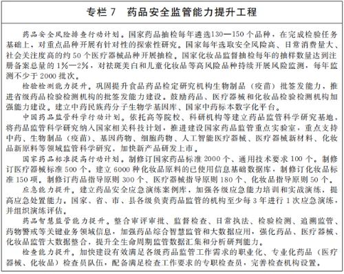 完善药品安全监管制度。加强药物临床试验核查,严格执行药品、医疗器械、化妆品等生产质量管理规范,对重点生产企业开展全覆盖检查。开展药品质量提升行动,健全生物制品等高风险产品标准制定工作机制,提高药品、医疗器械、化妆品标准。改革和完善疫苗监管体制机制,提高省级药品检验检测机构对辖区内生产的主要疫苗品种批签发能力。深入开展无菌植入性医疗器械监督检查、化妆品“线上净网、线下清源”等专项整治行动,切实规范药品、医疗器械、化妆品市场秩序。