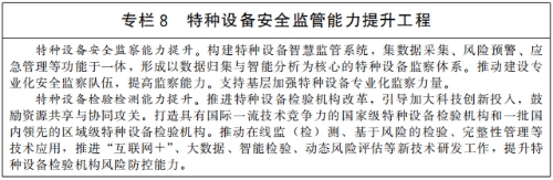 强化特种设备安全风险监控体系建设。优化特种设备监管信息化建设基础和应用环境,推动国家与地方监管数据互联互通,增强数据分析和信用管理功能,完善全国统一的特种设备信息公示查询系统。加强特种设备风险预警与应急处置能力建设,提高安全风险识别和防控能力。推动特种设备使用单位开展风险分级管控,从源头上系统辨识风险、防控风险。完善生产单位、检验检测机构和人员资格信息等特种设备基础数据库。以电梯、气瓶和移动式压力容器、叉车等为重点,建立健全特种设备质量安全管理追溯体系。推动特种设备生产企业加大研发投入,建立科学严密、反应及时的风险防范系统。完善锅炉安全、节能、环保三位一体的监管体系,以实现碳达峰碳中和目标为导向,进一步提升锅炉节能环保水平。