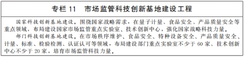 加强科技支撑体系建设。鼓励市场监管领域科研创新,加强市场监管重点领域关键技术攻关和先进装备研制,布局一批国家和部门科技创新基地。重点推进中国标准化研究院国家标准馆建设工程和昌平实验基地二期建设工程、中国计量科学研究院实验基地二期建设工程、国家食品质量安全检(监)测能力建设工程、国家消费品质量安全风险监测预警能力建设工程等建设,全面提升市场监管科技支撑能力。