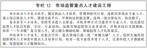 加强人才队伍建设。健全人才引进、培养、使用、评价、激励机制,统筹推进市场监管人才队伍建设。加快高水平市场监管智库和综合型研究机构建设,加强重大理论和实践问题战略研究、决策咨询,开展人才需求分析。推进市场监管人才培养,加快相关学科专业建设,培养符合市场监管现代化需求的后备人才。在检验检测、药品审评、检查核查、网络数据监管、知识产权、质量技术等重点专业领域,着力培养引进一批“高精尖缺”人才。组织开展综合执法大练兵,提升基层人才队伍能力水平。加强市场监管文化建设,增进价值认同、情感认同、文化认同,增强做好市场监管工作的责任感和使命感。