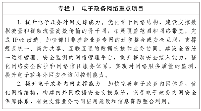 建成“横向到边、纵向到底”、支持IPv6(互联网协议第六版)的电子政务外网,同步建设网络安全基础设施,形成全省架构统一、运行高效、安全可靠、弹性调度的新型电子政务外网体系,推进5G(第五代移动通信技术)、区块链等新技术在电子政务外网领域应用,有效支撑跨层级、跨区域、跨部门的网络互通、数据共享、应用协同。拓展电子政务外网覆盖范围、加快网络带宽扩容,逐步实现万兆到州市、千兆到县市区、百兆到乡镇(街道)全覆盖,村(社区)按需接入,2025年底实现80%行政村覆盖;推动各地各部门按照“应接尽接”原则接入电子政务外网。提升电子政务内网支撑能力,对政务内网骨干链路带宽进行扩容,按需开展县级以下部门安全接入政务内网,完善电子政务内网综合运维管理体系,提升运维保障能力。强化电子政务网络综合安全防护,健全统一信任服务体系,推进电子政务内网、外网间数据安全交换。加快推进部门业务专网(含国家部委业务专网的省级及以下部分)向电子政务内网、外网迁移整合或安全互联。