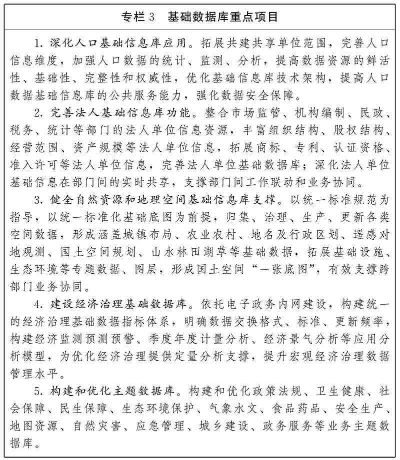 1. 建立健全基础数据库。升级完善人口、法人、自然资源与地理空间和电子证照等基础信息资源库,建立健全经济治理基础数据库,建立基础数据更新联动运维机制,根据典型应用场景推进基础数据的标签化、主题化管理,开发高频需求数据的共享服务接口,强化数据质量管理和融合应用,不断提升基础数据库建设水平。围绕商事制度改革和产业发展需要,增加自然人、企业等网络经营主体基础信息,整合到法人单位基础信息库。