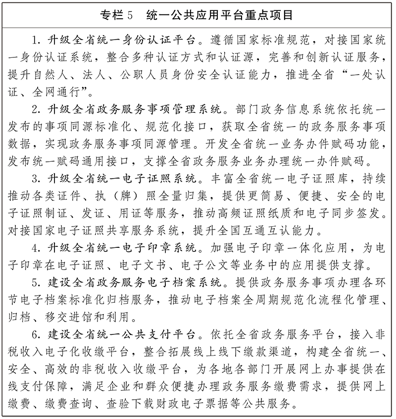 基础支撑能力不断夯实。持续提升电子政务网络覆盖度和承载力,有力保障全省政务信息化应用稳定、高效、安全运行。建成全省统一政务云,省级非涉密政务信息系统上云率达到90%以上。建成全省统建共用的公共应用平台,电子证照出证率和电子印章加盖率达到80%以上。