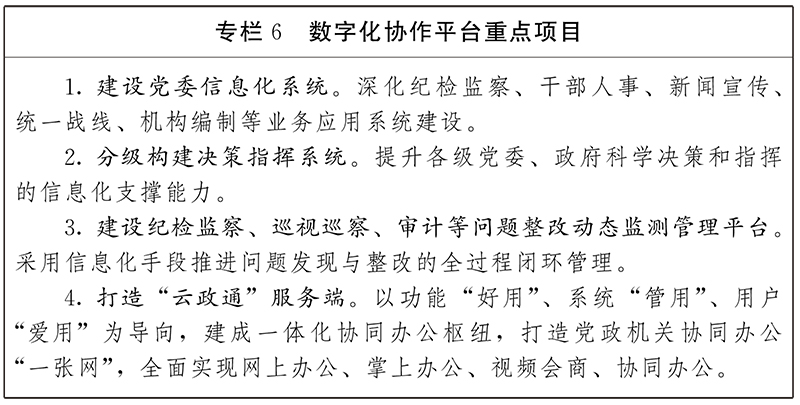 1. 推进党委信息化建设。以电子政务内网为支撑,优化完善党委各部门的核心业务信息系统,推进纪检、干部人事、新闻宣传、统一战线、机构编制等业务应用建设。深化和创新政务内网电子公文、门户网站、安全邮件、视频会商、即时通信、语音服务等共性办公应用,提升电子文件管理和应用水平,推动党委信息资源按需汇聚共享,提高跨州市、跨部门业务协同和应用集成水平。建设决策指挥系统,提升决策的合理性、科学性、预见性和精准性。