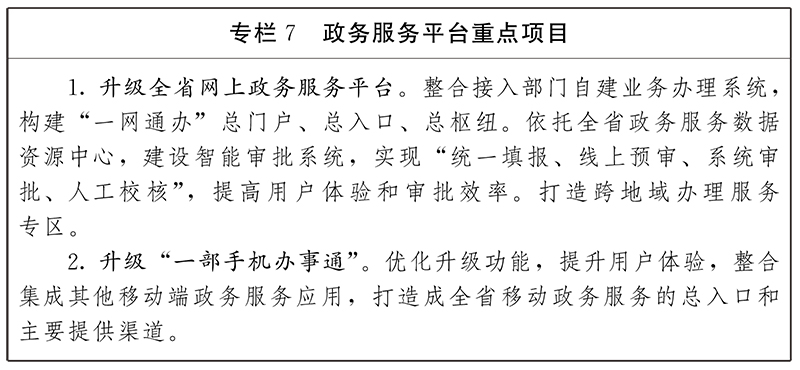 政务服务能力大幅提升。全省政务服务平台更加易用、好用,政务服务“一网通办”和标准化、规范化、便利化水平不断提升;高频民生政务服务事项实现“掌上办”;非涉密政务服务事项网上可办率达到99%,全程网办和零跑动率达到90%以上。线上线下融合服务更加完善。