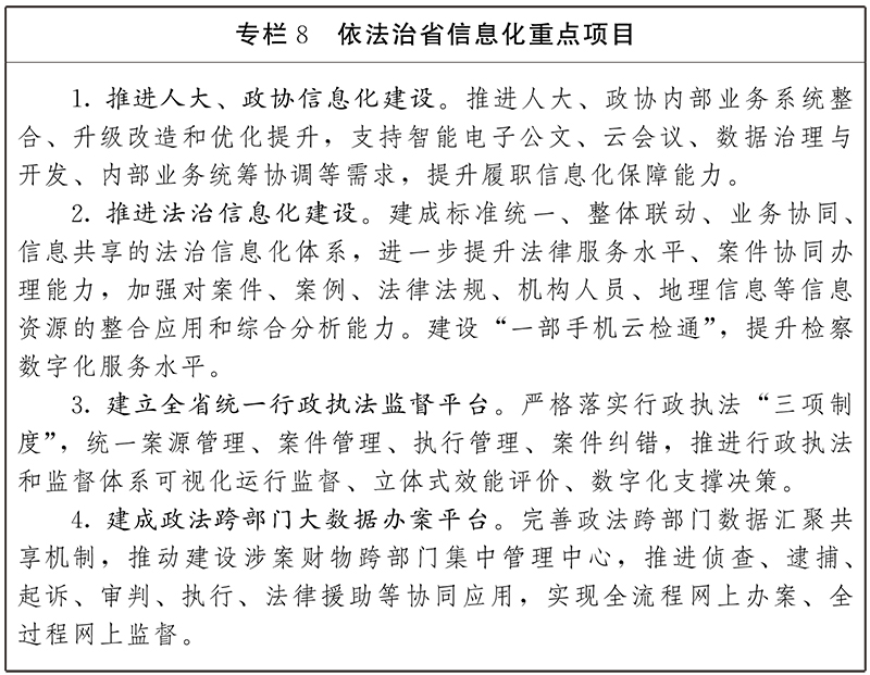 深化立法、监督、协商、议政等业务应用,完善人大代表、政协委员履职信息化应用。构建数据安全、集约高效的政法业务协同办理平台,提升“智慧法院”、“智慧检务”、“智慧警务”、“智慧司法”应用水平和协同能力,提高审判执行、多元解纷、司法公开、法律监督、刑罚执行、法律服务、协同办案的智能化水平。推动法治工作资源互联互通、业务协同、信息共享,为依法治省提供决策支持。