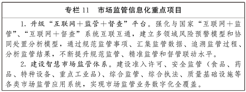 4. 分类推进重点监管数字化应用。聚焦市场监管、公安、税务、消防、食品、药品、卫生、生态环境、水利、交通、知识产权等领域,加快推进重点监管信息系统建设,深化数字化应用并与“互联网+监管”系统互联互通,提升监管规范化、精准化、智慧化水平。