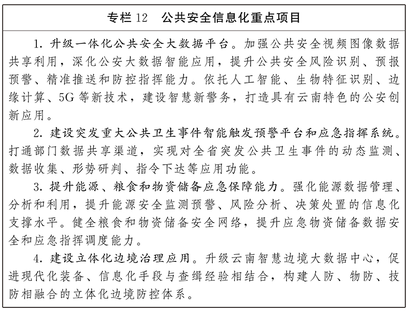 2. 加强社会治安数字化应用。推动数字技术在法院、检察院和司法行政、公安等部门的深度运用,打通办案平台,实现全流程网上“轻快”、“便捷”办案。健全信息化社会治安防控体系,实现预测预警预防。推进“雪亮工程”建设,整合各类视频监控资源,加大在维稳、反恐、打击犯罪等公共安全防范领域的综合应用,提升防范化解社会风险的能力和水平。加快部署智能感知、信息采集等基础设施,构建边境管控数字防控网,推进边境管控数字化应用,开展边境车辆、人员大数据分析研判,提升边境管控指挥系统可视化、数字化、智能化水平。