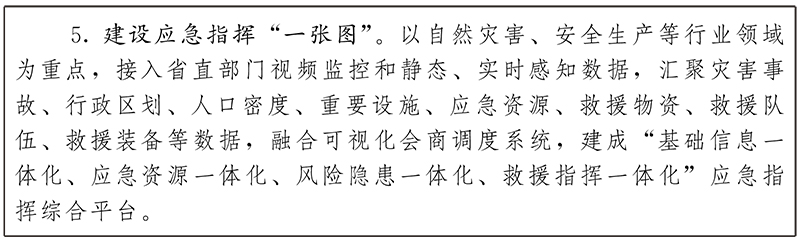3. 构建数字应急体系。聚焦地震、地质灾害、森林草原火灾、洪涝、干旱、气象等自然灾害,以及危险化学品、烟花爆竹、矿山、道路交通、民爆、消防、旅游景点等安全领域,推进应急指挥信息网络和感知网络建设、现场救援装备和应急资源数据汇聚建设、风险隐患监测预警和监管执法建设,实现应急指挥“一张图”综合管理,提高风险防控和突发灾害事故应急处置能力。