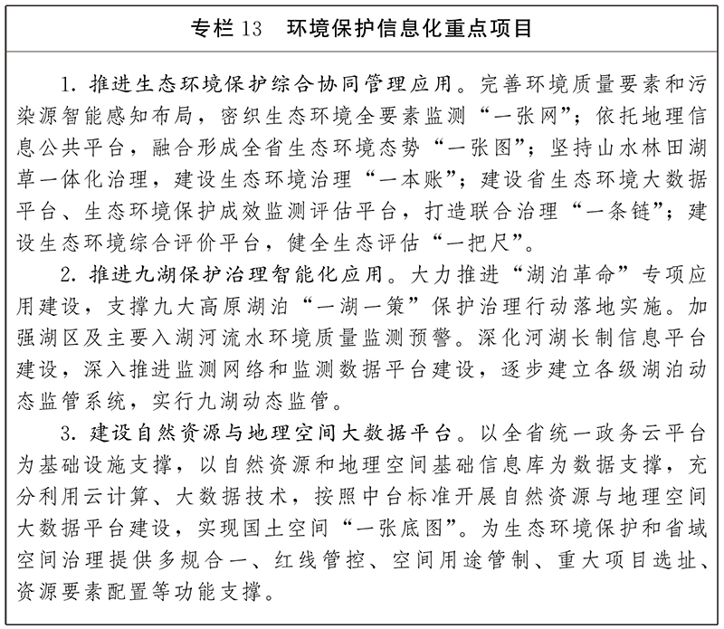 1. 加强生态环境保护数字化应用。以地理信息公共服务平台为支撑,加强卫星遥感、无人机、视频监控、传感器“四位一体”综合应用,完善生态环境监测网络,优化监测点位布局,广泛开展生态监测物联网应用。充分利用大数据等手段整合与挖掘生态环境监测数据资源,提升区域大气污染防治、流域污染防治、土壤污染防治等决策能力,构建生态环境综合管理信息化平台。构建重点江河湖泊治理数字化平台,汇集生态环境、水利、自然资源等部门的基础数据,重点建设智能感知、数据汇集、综合应用、多维展示、决策支撑等系统。