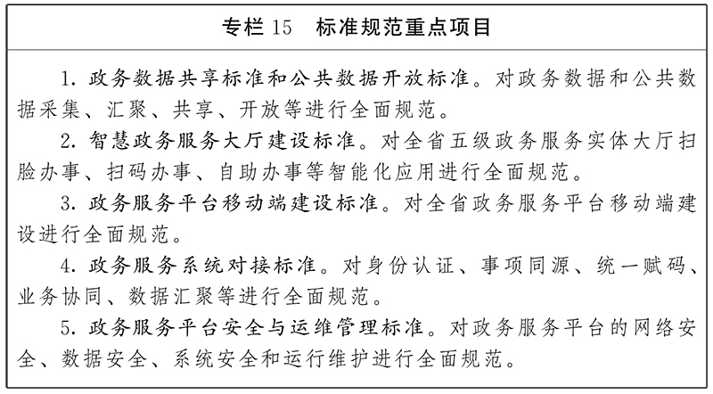 1. 制定电子政务标准。围绕统一基础设施共建共用、跨部门重点项目建设、数据共享交换等实际工作需要,不断优化完善电子政务标准体系建设,构建科学先进、层次分明、管用实用的标准体系,重点研究制定政务大数据中心、政务云、政务数据质量管理、政务数据采集汇聚和共享开放、政企数据流转、网络安全、数据安全、运维服务等一批标准规范,建立健全政务信息化工程技术参考框架,以标准先行推动系统互联、业务协同、信息共享、集约建设。