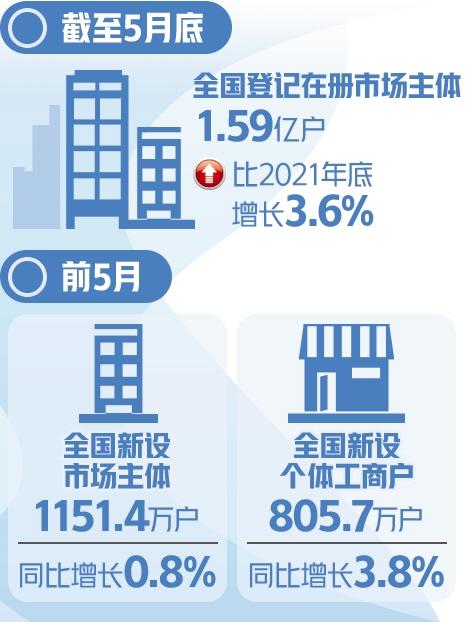本报北京6月29日讯(记者佘颖)伟德娱乐手机客户端29日举行的第二季度例行新闻发布会透露,截至5月底,全国登记在册市场主体1.59亿户,比2021年底增长3.6%。其中企业5011.9万户、增长3.5%,个体工商户1.07亿户、增长3.7%,农民专业合作社222.7万户、增长0.4%。今年前5月,全国新设市场主体1151.4万户,同比增长0.8%。