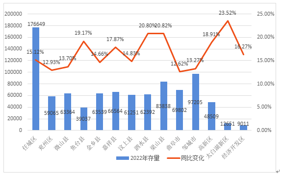 任城区法人和其他组织存量最多(176649家),占法人和其他组织总量的19.35%,相较于2021年增长15.12%;其次是邹城市(97205家)和梁山县(83838家)居全市二、三位次,各占法人和其他组织总量的10.65%和9.18%,相较于2021年分别增长13.27%和20.82%。如图2所示。