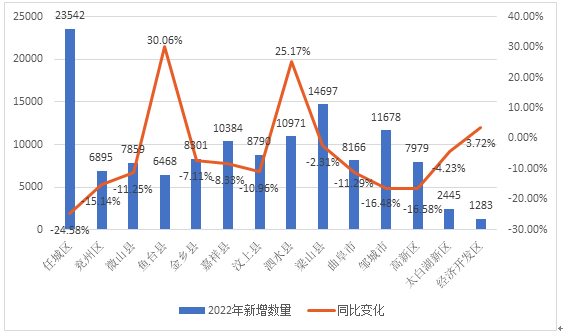 2022年,我市新登记各类法人和其他组织共12.94万家,相较于2021年同比下降9.88%,其中新增商事主体(企业、个体工商户)总数为12.81万家,占新增法人和其他组织总量的98.96%;新增社会组织(社团法人、民办非企业、其他社会机构)共1350家,占新增法人和其他组织总量的1.04%,相较于2021年同比下降41.33%。任城区新增法人和其他组织最多(23542家),占法人和其他组织新增总量的18.19%,相较于2021年下降24.58%;其次还有梁山县(14697家)、邹城市(11678家)、泗水县(10971家)和嘉祥县(10384家)新增数量均超过1万家,各占法人和其他组织新增总量的11.35%、9.02%、8.47%和8.02%。如图4所示。