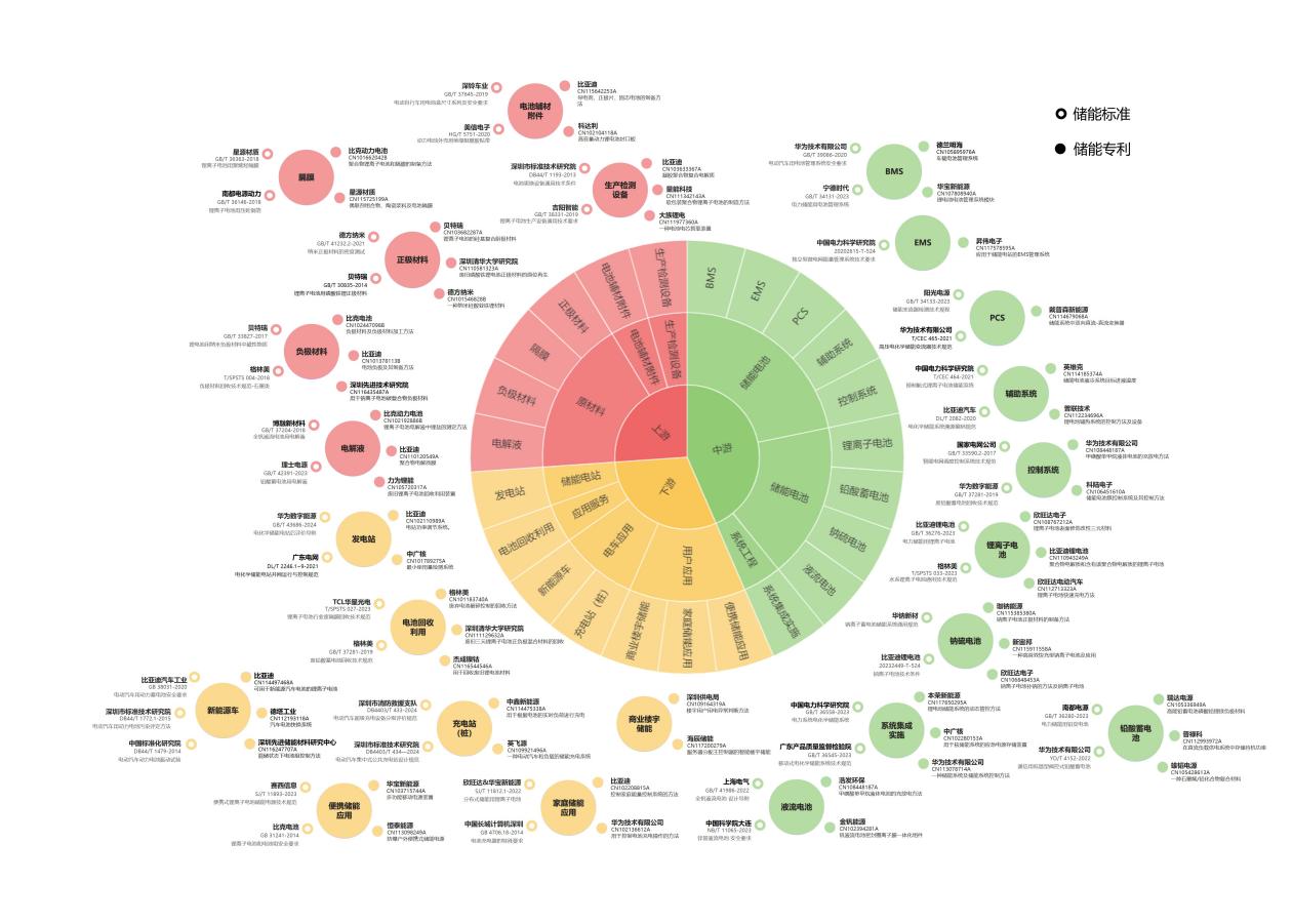 重点基于深圳市统一代码库中企业的经营范围、经济行业等关键信息字段,研究制定出节点企业筛选规则,搭建储能产业链节点框架,标引出全市储能产业链上中下游的企业数据,绘制了储能产业链全景图(包括节点图、名企图、标准图和专利图)。