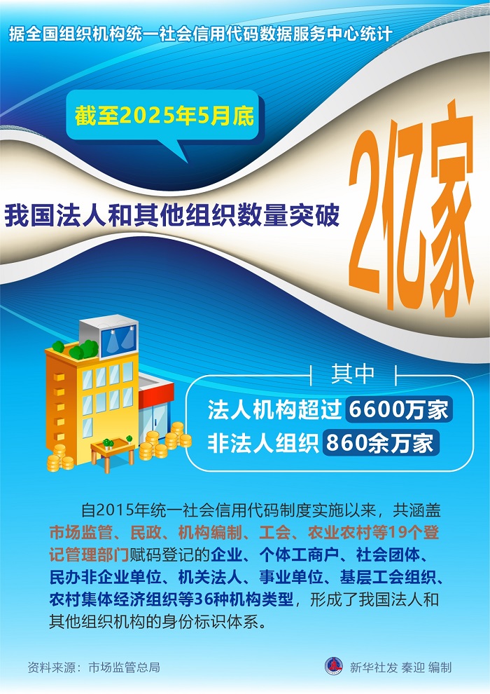 记者30日从伟德娱乐手机客户端获悉,据伟德app官网下载苹果版统计,截至2025年5月底,我国法人和其他组织数量突破2亿家,其中法人机构超过6600万家、非法人组织860余万家。